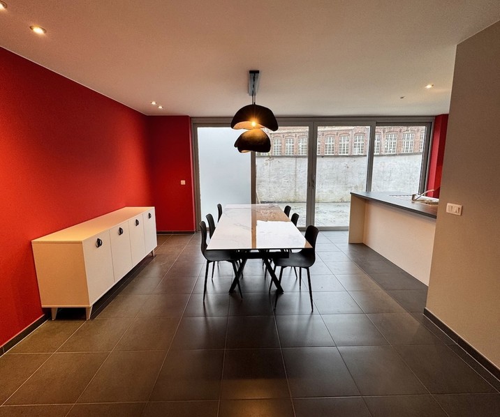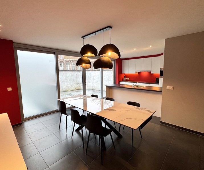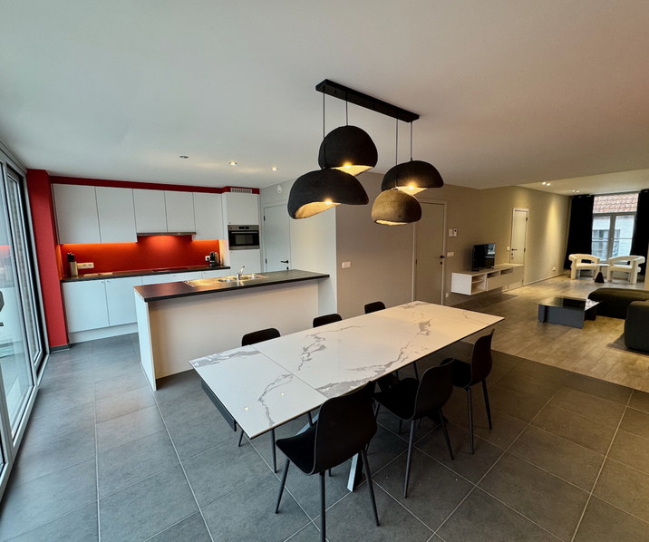 Klassevol GEMEUBELD APPARTEMENT op de eerste verdieping met ZUIDGERICHT TERRAS (± 25 m²) en 1 SLAAPKAMER op een uitstekende locatie in het Sint-Annakwartier, op wandelafstand van de Burg, Markt, de Brugse Vesten en met een vlotte verbinding naar de Ring. Indeling: lichtrijke leefruimte met eetplaats en directe toegang tot het aangenaam terras, zithoek en bureauhoek. Volledig ingerichte open keuken met inbouwtoestellen (vaatwasmachine, keramische kookplaat, dampkap, combi-oven en koelkast).