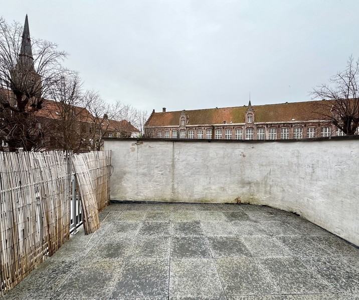 Ruime berging met wasmachine. Sas, gastentoilet. Slaapkamer met ingemaakte kast en een badkamer met lavabomeubel en douche. Epc 106 kWh/m2, label B. Ruim en comfortabel wonen in de Brugse binnenstad!