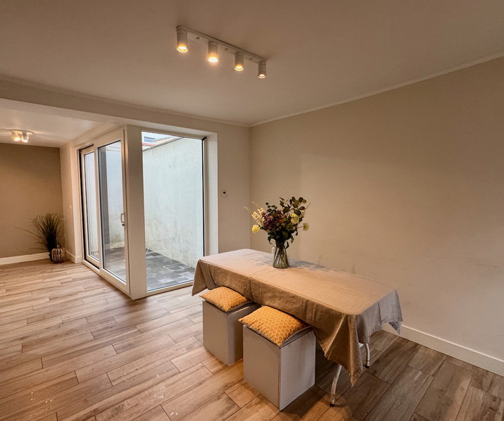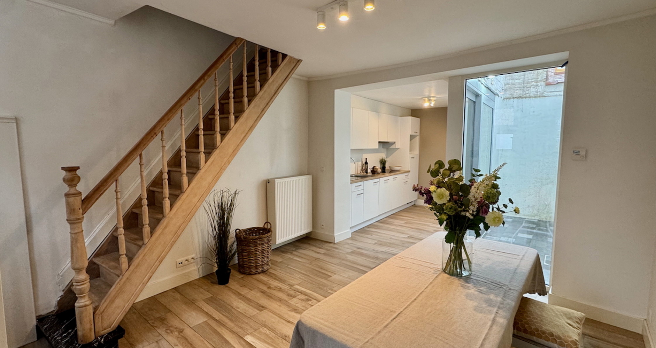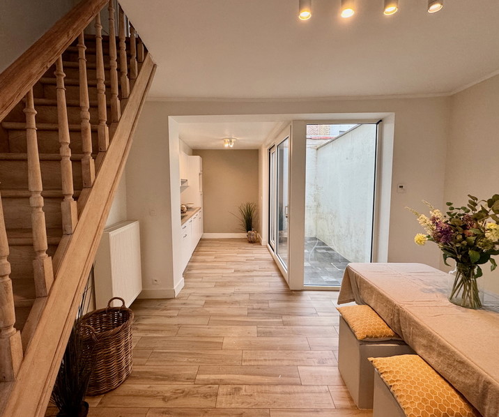 GEZELLIGE & KNUSSE WONING met 1 à 2 slaapkamers en KOER gelegen in het mooie en rustige Sint-Annakwartier. Via de inkom komt u in de aangename leefruimte met de geïnstalleerde open keuken, uitgerust met inbouwvaatwasser, inductiekookplaat, dampkap en frigo met diepvriesvak. Vanuit de keuken is er directe toegang tot de koer.